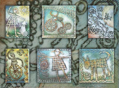 Six whimsical collagraphic works on one fabric panel.